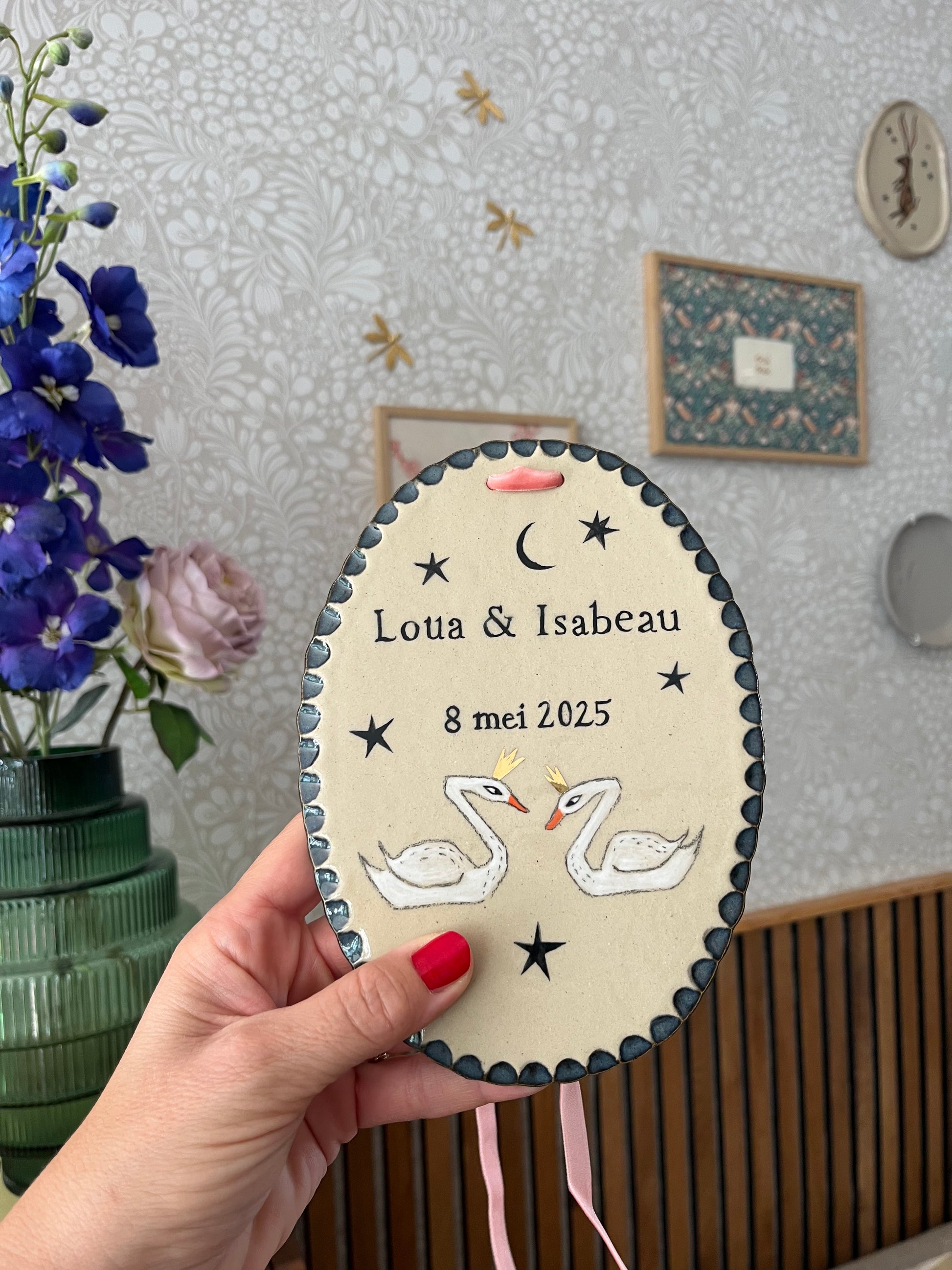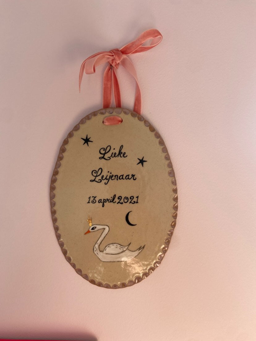 Het product wordt op maat gemaakt en kan hierdoor niet geruild of retour worden gestuurd. Duur eerste bordjes : 4-6 weken