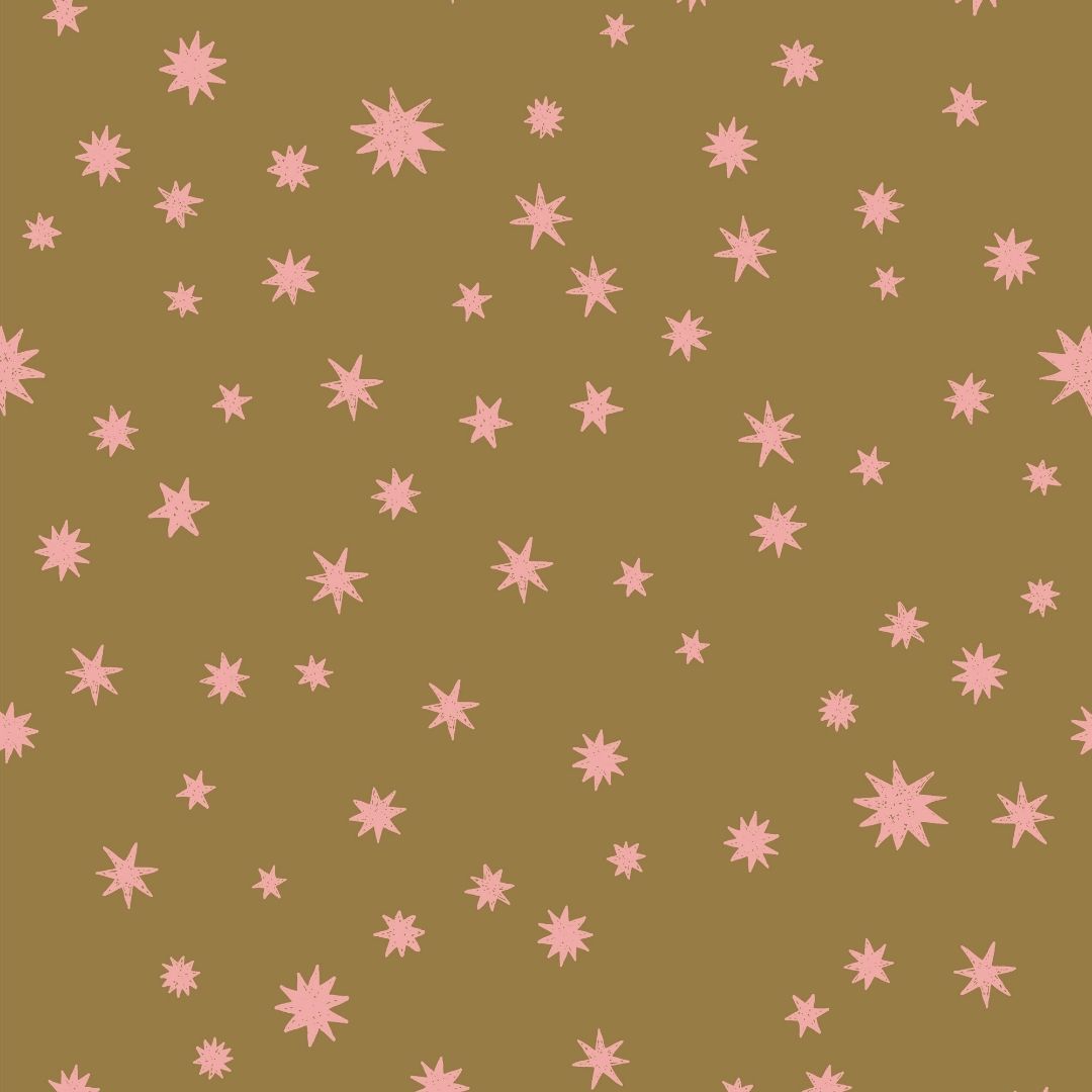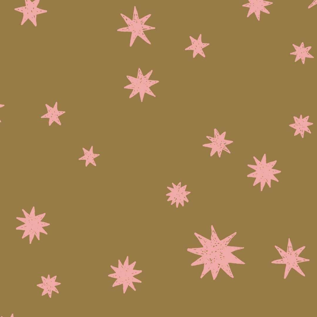 Het Starry Night design is verkrijgbaar in meerdere kleurvarianten, waaronder deze met een kaki achtergrond en roze sterren.