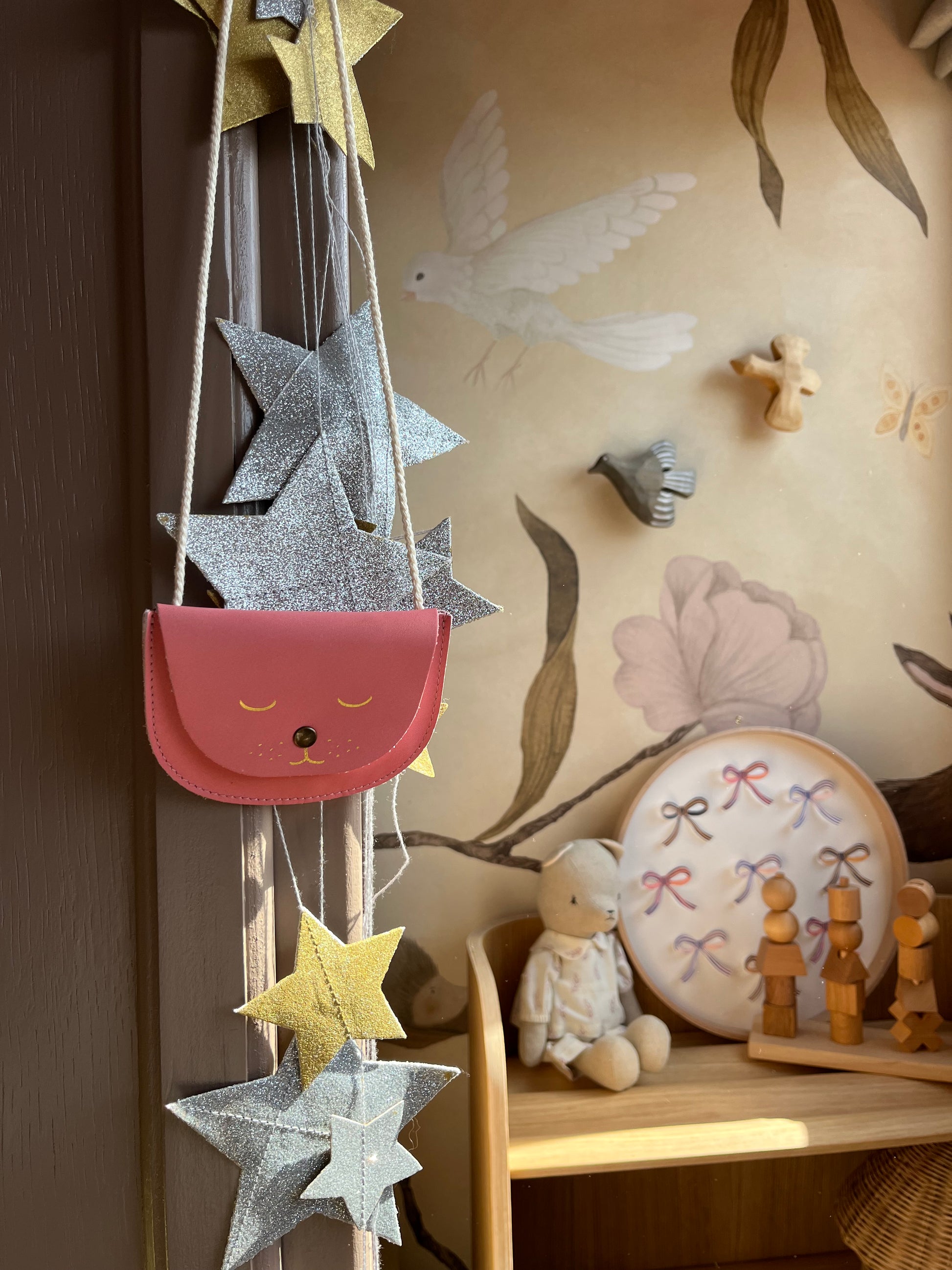Schattig klein tasje van volnerfleer met een zacht lamsleergevoel en een gevlochten koord. Gouden hotstamping van een klein slapend katje. Om mama te imiteren, te dragen als schoudertas vanaf 1,5 jaar en tot ongeveer 6 jaar.