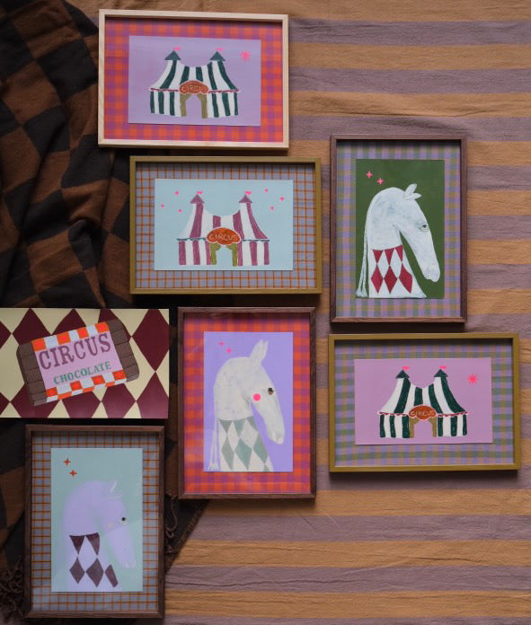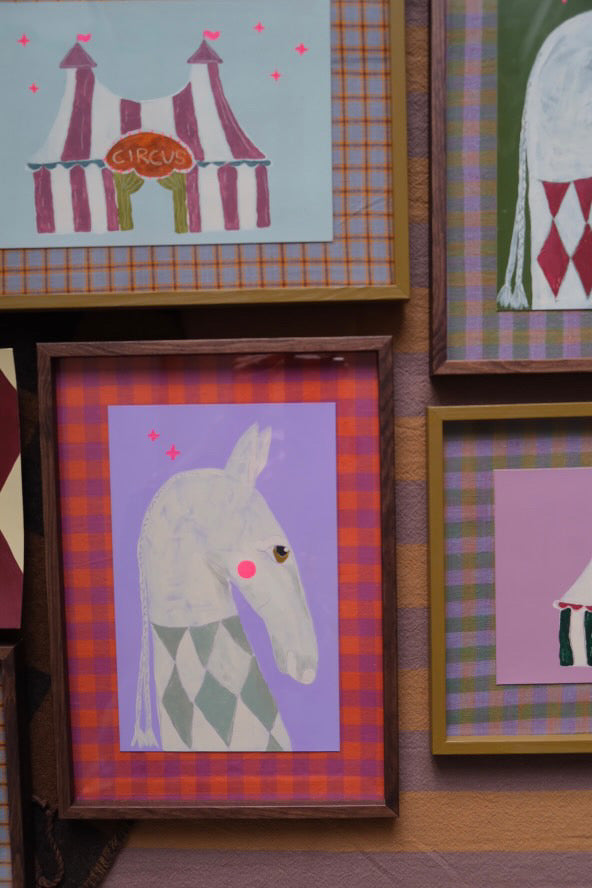 🍀 Paard schilderijtjes : Acryl op gerecycled karton. Ingelijst in A4 massief hout lijsten. Achter de kunstwerkjes zit een prachtig, met de handgeweven katoen, stof uit India.